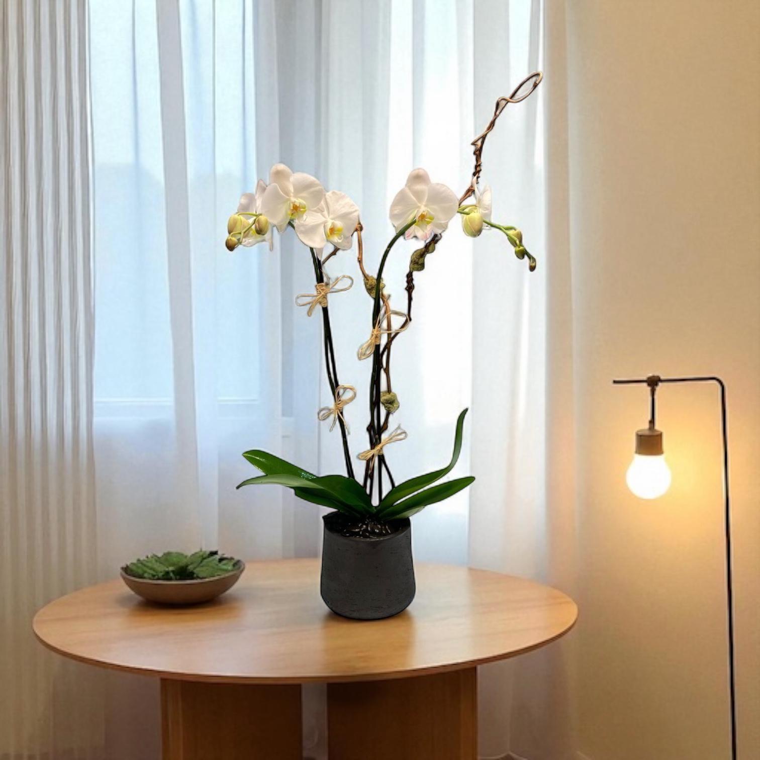 Keep orchids in indirect sunlight, water weekly, and avoid overwatering. Trim faded blooms to encourage new growth.